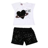 Костюм для девочки из эластичного х/б трикотажа.Футболка с принтом "я люблю свой мир", украшенным пайетками. Полуприлегающий силуэт. Застежка пуговица на спинке. Рукав-крылышко.