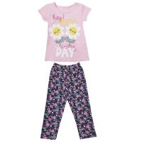 Комплект для девочки состоящий из футболки и лосин. Выполнен из эластичного х/б трикотажа (кулирное полотно).Футболка прямого кроя. Передняя половинка футболки декорирована принтом "Две ромашки". Вырез горловины круглый, обработан бейкой из эластичного полотна в тон. Рукав короткий, втачной. Низ изделия и рукавов обработан швом вподгибку двойной строчкой.