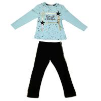 Костюм для девочки.Джемпер прямого кроя, эластичного х/б трикотажа. Горловина отделана тонкой манжетой. На полочке надпись, и апликации "звездочки" из конусных страз и киперной ленты с люрексом.Рукав прямой.