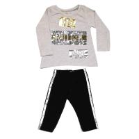 Костюм для девочки из эластичного х/б трикотажа.Джемпер с блестящей надписью и вышивкой из пайеток. Силуэт трапеция. Длинный рукав. Горловина на трикотажном манжете. Фигурный, вогнутый низ.