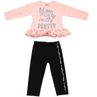 Костюм для девочки, из эластичного х/б трикотажа.Джемпер с надписью- принтом из блестящей краски, украшенной стразами. Полуприлегающий силуэт. Горловина отделана трикотажным кантом. По низу рюшки из трикотажа и фатина в горошек.