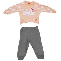 Костюм для девочки из х/б трикотажа.Джемпер с нежным принтом-термотрансфером из прорезиненного материалла. Рукав-реглан. Горловина, рукав, низ джемпера на манжетах.