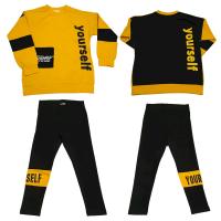 Костюм для девочки, из эластичного х/б трикотажа.Джемпер удлиненный, с крупными надписями на полочке и на спинке, и накладным карманом с текстом. Широкий крой, заниженная пройма, спущенное плечо. Горловина, рукав, низ джемпера на трикотажных манжетах. На рукавах вставки из трикотажа дугого цвета.