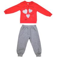 Костюм для девочки, из х/б трикотажа.Джемпер из трикотажа интерлок, с красочным принтом "сердечки", из парчи и блестящей краски. Горловина, рукав, низ джемпера на трикотажных манжетах.