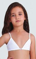 Топ белого цвета, на тонких бретельках из эластичной резинки, с треугольными чашками. Под грудью эластичная резинка. Застежка пластиковый крючок.Размер 3 (5-6 лет): длина- 17 см, обхват под грудью- 50-56 см.