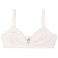 Топ кремового цвета, на тонких бретелях. Выполнен из эластичного х/б трикотажа кулирное полотно. Чашечки с вытачкой, украшены резинкой с фестончатым краем. Низ топа, вырез на спинке и проймы отделаны трикотажным кантом.Размер 3 (5-6 лет): длина- 21 см, обхват груди- 56 см, обхват под грудью- 46-52 см.