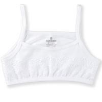 Топ для девочек, белого цвета, из эластичного х/б трикотажа, на тонких бретелях. Бретели, отделка выреза, пройм из трикотажного канта, Нижняя часть на закрытой резинке. Украшен кружевом.Размер 5 (146-152): длина- 22 см, обхват груди- 58 см, обхват под грудью- 52-58 см.