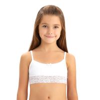 Топ белого цвета, на тонких бретельках из эластичной резинки. Горловина отделана кантом с фистончатым краем. Под грудью эластичное кружево. Украшен атласным бантиком.Размер 3 (5-6 лет): длина- 19 см, обхват груди- 52 см, обхват под грудью- 44-48 см.