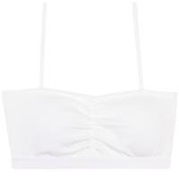 Детский бельевой топ с вынимающимися чашечками. Выполнен из мягкого и дышащего х/б трикотажа (кулирное полотно). Топ-бюстье представлен в базовом белом цвете. Бретели, вырез и проймы отделаны эластичным кантом в цвет изделия. Под грудью на мягкой широкой резинке с надписью на английском языке. Спереди, по центру, сборка на резиночке.Размер 6 (11-12 лет): длина - 28 см, обхват груди - 55-65 см, обхват под грудью - 54-64 см.