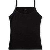 Майка для девочки на тонких бретелях. Выполнена из эластичного х/б трикотажа кулирное полотно. Модель полуприталенного силуэта в черном цвете. Вырез, бретели, проймы отделаны эластичным трикотажным кантом. Низ изделия обработан швом вподгибку двойной строчкой.Размер 3 (122-128): длина- 45 см, обхват груди- 60 см.