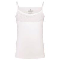 Майка для девочки на тонких бретелях. Выполнена из эластичного х/б трикотажа кулирное полотно. Модель в белом цвете полуприталенного силуэта. Декорирована на груди кружевом с цветочным рисунком и атласным бантиком. Бретели, проймы и отделка выреза из эластичного трикотажного канта. Низ изделия обработан швом вподгибку двойной строчкой.Размер 3 (122-128): длина- 45 см, обхват груди- 58 см.