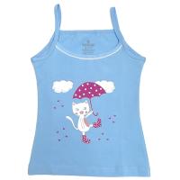Маечка для девочки из однотонного трикотажа (кулирное полотно). Украшена ярким принтом "Кошечка с зонтиком". Полуприлегающий силуэт. Тонкие бретели. Полукруглый вырез, украшен тонкой ажурной тесьмой. Вырез, бретели, проймы отделаны эластичным трикотажным кантом. Низ изделия обработан швом вподгибку двойной строчкой.Размер 0 (86-92), длина- 37 см, обхват груди- 44 см.