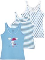 Маечка для девочки, из эластичного х/б трикотажа с различными принтами: из трикотажа в горошек/ из трикотажа в полоску/ из однотонного трикотажа с принтом "кошечка с зонтиком". Полуприлегающий силуэт. Широкие бретели отделаны эластичным трикотажным кантом.ВНИМАНИЕ! Расцветка может прийти любая, из представленных на фото.
