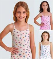 Маечка для девочки, из эластичного, х/б трикотажа, с красочными, разноцветными рисунками "бабочки". Полуприлегающий силуэт. Тонкие бретели из эластичного трикотажа.ВНИМАНИЕ! Расцветка может прийти любая, из представленных на фото.