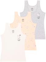 Майка для девочки на широких бретелях. Модель приталенного покроя. Выполнена из эластичного х/б трикотажа кулирное полотно. Декорирована нежным принтом "Кошечки". Отделка выреза и пройм из эластичного трикотажного канта из основного полотна. Низ изделия обработан швом вподгибку двойной строчкой.Размер 1 (98-104): длина - 42 см, обхват груди - 52 см.