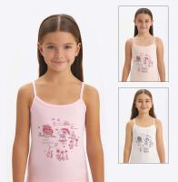 Маечка для девочки, из эластичного х/б трикотажа с красочным принтом. Полуприлегающий силуэт. Тонкие бретели из эластичного трикотажа.ВНИМАНИЕ! Расцветка может прийти любая, из представленных на фото.