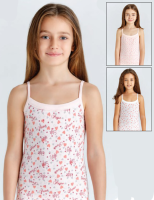 Маечка для девочки, из эластичного х/б трикотажа с красочными рисунками "сердечки/звездочки". Полуприлегающий силуэт. Тонкие бретели из эластичного трикотажа. Вырез спереди отделан широким трикотажным кантом.ВНИМАНИЕ! Расцветка может прийти любая, из представленных на фото.