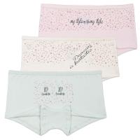 Трусы-шорты для девочки. Выполнены из эластичного х/б трикотажа кулирное полотно. Передняя половинка декорирована надписями на английском языке. В поясе отделаны эластичным трикотажным кантом в тон полотна. Хлопковая ластовица. В проймах с подворотом.ВНИМАНИЕ! Товар продается в количестве 3 штук, одного размера, в трех расцветках. Расцветка может прийти любая, из представленных на фото.