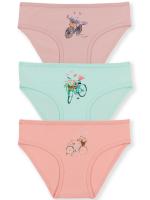 Трусы-слипы для девочки. Выполнены из эластичного х/б трикотажа кулирное полотно. Декорированы принтом "Велосипед". В поясе и проймах отделаны эластичным трикотажным кантом из основного полотна. Ластовица из хлопка.Товар продается в количестве 3 штук, одного размера, в трех расцветках.