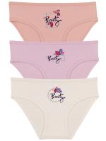 Трусы-слипы для девочки. Выполнены из эластичного х/б трикотажа кулирное полотно. Декорированы принтом "Красота". В поясе и проймах отделаны эластичным трикотажным кантом из основного полотна.Товар продается в количестве 3 штук, одного размера, в трех расцветках.