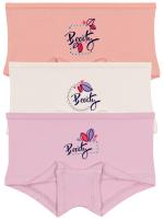 Трусы-шорты для девочки. Выполнены из эластичного х/б трикотажа кулирное полотно. Передняя половинка декорирована надписью на английском языке "Красота". В поясе отделаны эластичным трикотажным кантом в тон полотна. Хлопковая ластовица. В проймах с подворотом.Товар продается в количестве 3 штук, одного размера, в трех расцветках.