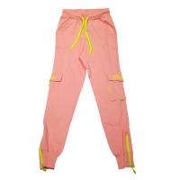 Штаны для девочки.Штаны прямого кроя, на манжетах, на манжете с резинкой и ярким шнурком в поясе. Два боковых прорезных кармана. На одной штанине накладной карман с клапаном и отделкой ярким трикотажем и надписью. На другой штанине клапан с надписью и декоративной тесьмой. Низ штанин на ярких застежках на молнии.