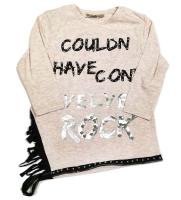 Туника для девочки. Прямой крой. Асимметричный низ изделия с декоротивными элементами. Рукав 3/4. На полочке принт украшенный бусинами.