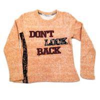 Джемпер для девочки, утепленный, из эластичного х/б футера, с начесом с двух сторон. На груди принт-надпись из кожи и черного кружева. Полуприлегающий силуэт. Н полочке фигурная нашивка из кружева. Горловина на манжете. Снизу, по бокам, небольшие разрезы.Размер 140: длина 50 см, обхват груди 74 см, длина рукава 50 см.