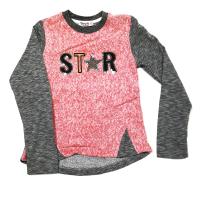 Джемпер для девочки, из эластичного х/б трикотажа, с принтом-надписью из кожи и пайеток. Прямой крой. Полочка из трикотажа с рельефным рисунком, по низу с фигурными вставками из однотонного трикотажа. Горловина на трикотажном манжете. Спинка с полукруглым низом.Размер 140: длина 59 см, обхват груди 76 см, длина рукава 52 см.