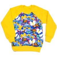 Джемпер для девочки, из футера однотонного и с красочным, многоцветным принтом "бабочки". Рукав-реглан. Горловина, рукав, низ джемпера на трикотажных манжетах.Размер 104: длина- 45 см, обхват груди- 62 см, длина рукава по внутреннему шву- 31 см.