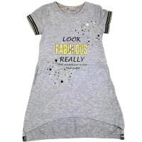 Туника для девочки. Удлинённая спинка, по бокам небольшие разрезы. Спереди асимметричный низ изделия. В боковых швах карманы. На полочке принт.Параметры модели: