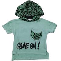 Футболка для девочки из эластичного х/б трикотажа, с капюшоном из трикотажа с рисунками. На груди накладной карман с клапаном и вставкой из трикотажа с рисунками. Футболка украшена надписью со стразами. Спинка удлиненная.Размер 110: длина 40 см, обхват груди 66 см.