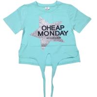 Футболка из эластичного х/б трикотажа, с блестящим принтом "звезда"на груди. Горловина на манжете, с внутренней отделкой на спинке трикотажным кантом. По бокам небольшие разрезы. Полочка футболки укороченная, с завязками по центру.Размер 128: длина 42 см, обхват груди 70 см.