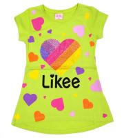 Футболка для девочки. А-силуэт. Удлинённая спинка. На полочке принт украшенный стразами Like.Рост 110 см, длина по спинке- 50 см, обхват груди- 60 см.