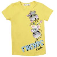 Футболка для девочки с коротким втачным рукавом. Выполнена из хлопкового трикотажа - кулирное полотно. Модель прямого силуэта. Передняя половинка декорирована ярким принтом "Друзья жирафики". Вырез горловины круглый, обработан бейкой из эластичного полотна в тон. Низ изделия и рукавов обработан швом вподгибку двойной строчкой.Размер 92: длина- 35 см, обхват груди- 51 см.