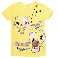 Футболка для девочки с коротким втачным рукавом. Выполнена из хлопкового трикотажа - кулирное полотно. Модель прямого силуэта. Декорирована надписью на английском языке "Воплоти свои мечты в реальность" и очаровательным принтом "Кошечки". Вырез горловины круглый, обработан бейкой из эластичного полотна в тон. Низ изделия и рукавов обработан швом вподгибку двойной строчкой.Размер 92: длина- 36 см, обхват груди- 53 см.
