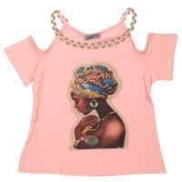 Футболка для девочки с красочным, нашитым из ткани принтом, украшенным стразами, бусинами и металлической серьгой "месяц". Полуприлегающий силуэт. Рукав с разрезом на плече. Горловина и рукав отделаны трикотажным кантом. Горловина украшена декоративной тесьмой.Размер 146: длина 42 см, обхват груди 74 см.