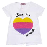 Футболка для девочки, из эластичного, х/б трикотажа, с красочным принтом "сердце". Полуприлегающий силуэт. Короткий рукав. Горловина отделана трикотажным кантом. Шов по центру спинки, с небольшим разрезом снизу.Размер 86: длина 35 см, обхват груди 50 см.