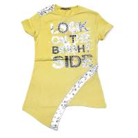 Туника для девочки, из эластичного х/б трикотажа, с яркими галографическими надписями, украшенными бусинами. Полуприлегающий силуэт. Горловина отделана трикотажным кантом. На полочке вставки из парчи с бусинами. Фигурный низ на полочке.Размер 134: длина 55 см, обхват груди 70 см.
