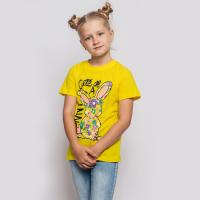 Футболка для девочки - прямого силуэта. Полочка украшена термопечатью "Кролик". Горловина круглая, на тонком трикотажном манжете в цвет изделия. Втачной короткий рукав. Низ изделия и рукавов обработан швом вподгибку двойной строчкой.Размер 104: длина- 41 см, обхват груди- 60 см.
