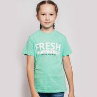 Футболка для девочки - прямого кроя. На полочке яркий принт с надписью "Свежий взгляд, свежий тренд". Горловина круглая, на тонком трикотажном манжете в цвет изделия. Втачной короткий рукав. Низ изделия и рукавов обработан швом вподгибку двойной строчкой.Размер 134: длина- 51 см, обхват груди- 70 см.