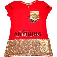 Туника для девочки свободного кроя. Снизу по боковым швам разрезы. На полочке принт. Спереди низ туники украшен пайетками.Размер 140: длина- 53 см, обхват груди- 70 см.