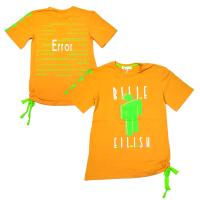 Футболка для девочки, из эластичного х/б трикотажа, со стильным, ярким принтом Billie Eilish, украшенным стразами. Удлиненный крой. Горловина на трикотажном манжете, с внутренней отделкой трикотажным кантом со стороны спинки. На рукавах рисунки. Надписи на спинке. Левый боковой шов присобран на яркие завязки.Размер 140: длина- 64 см, обхват груди- 86 см.