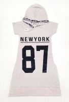 Туника с капюшоном. Удлинённая спинка. Снизу по боковым швам разрезы. На полочке принт.Размер 140: длина по спинке- 74 см, обхват груди- 70 см.