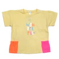 Футболка для девочки, из эластичного, х/б трикотажа, с разноцветной надписью на груди "удивительная" и яркими, неоновыми, накладными карманчиками из болоньи. Прямой, широкий крой, спущенное плечо. Короткий рукав. Горловина на трикотажном манжете.Размер 86: длина 33 см, обхват груди 54 см.