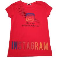 Футболка для девочки с втачным коротким рукавом. Прямого кроя. Удлиненный вариант. Выполнена из хлопкового трикотажа кулирное полотно. Модель полочки и спинки декорирована принтом и надписями с логотипом "Инстаграм". Горловина с круглым вырезом, на тонком трикотажном манжете. Низ изделия и рукавов обработан швом вподгибку двойной строчкой.Размер 140: длина- 55 см, обхват груди- 74 см.