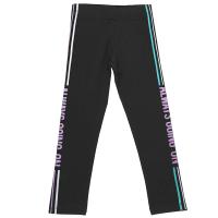 Лосины для девочки из эластичного трикотажа. В поясе на закрытой резинке. По бокам на штанинах яркие термо-полоски и надписи. Низ лосин обработан швом вподгибку двойной строчкой.
