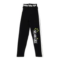 Лосины для девочки, из эластичного, х/б трикотажа.В поясе на двух резинках: эластичной резинке с надписями и под ней, на закрытой резинке. Место сшива резинок - по центру, с разрезами по бокам. На одной штанине крупная надпись, украшенная стразами. По бокам лосин лампасы - полоски.