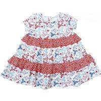Платье расклешенное, на круглой кокетке, двухярусной юбкочке со сборкой, из х/б трикотажа с рисунками "рыбки" и рюшечками в горошек. Горловина отделана трикотажным кантом. Застежка пуговицы на кокетке спинки.Размер 80 длина 38 см, обхват груди 50 см.