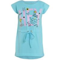 Платье из х/б трикотажа, с красочным принтом, украшенным блестящей краской. Прямой силуэт, Горловина с внутренней стороны отделана трикотажным кантом. Заниженная пройма, спущенное плечо. В поясе на кулиске с завязками из трикотажа. Спинка удлиненная, с полукруглым низом.Размер 98 длина 47 см, обхват груди 52 см.